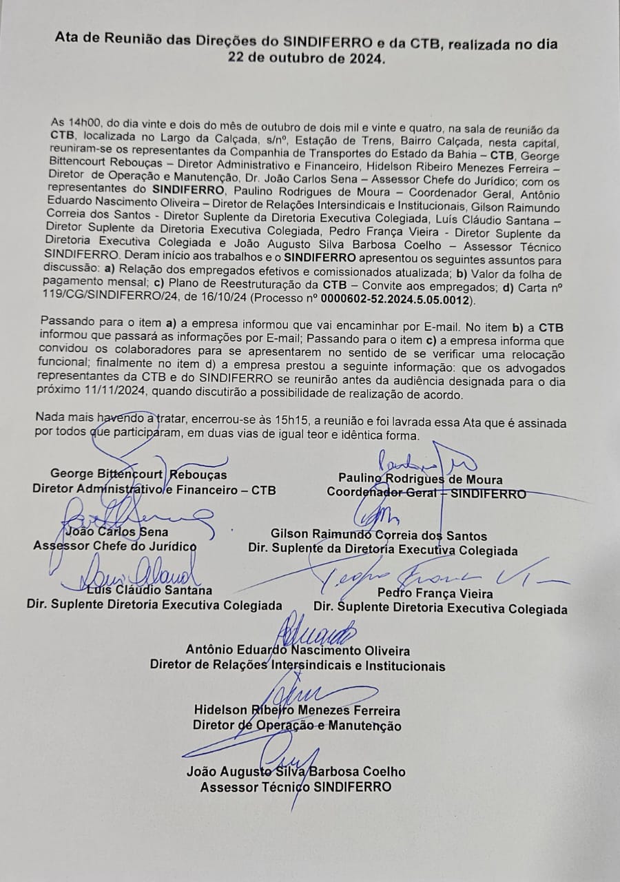 Estiveram presentes pelo lado do SINDIFERRO, os diretores: Paulino Moura, Antonio Eduardo, Pedro França, Gilson Corrreia, Luís Cláudio e João Augusto. Já por parte da empresa, participaram: George Bittencourt e Hidelson Menezes e Dr. João Carlos Sena. Segue ata.